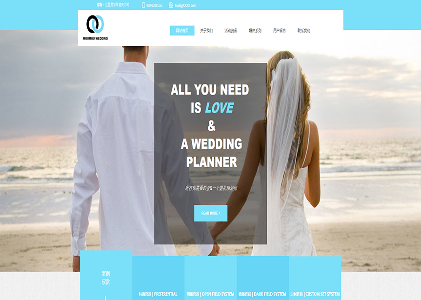 網(wǎng)站模板名稱:(帶手機版數(shù)據(jù)同步)自適應(yīng)婚禮婚慶類淺藍色網(wǎng)站模板